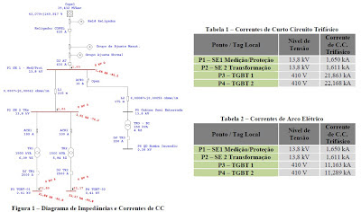 O diagrama unifilar, as correntes de curto-circuito sólido e de arco podem ser verificadas abaixo: